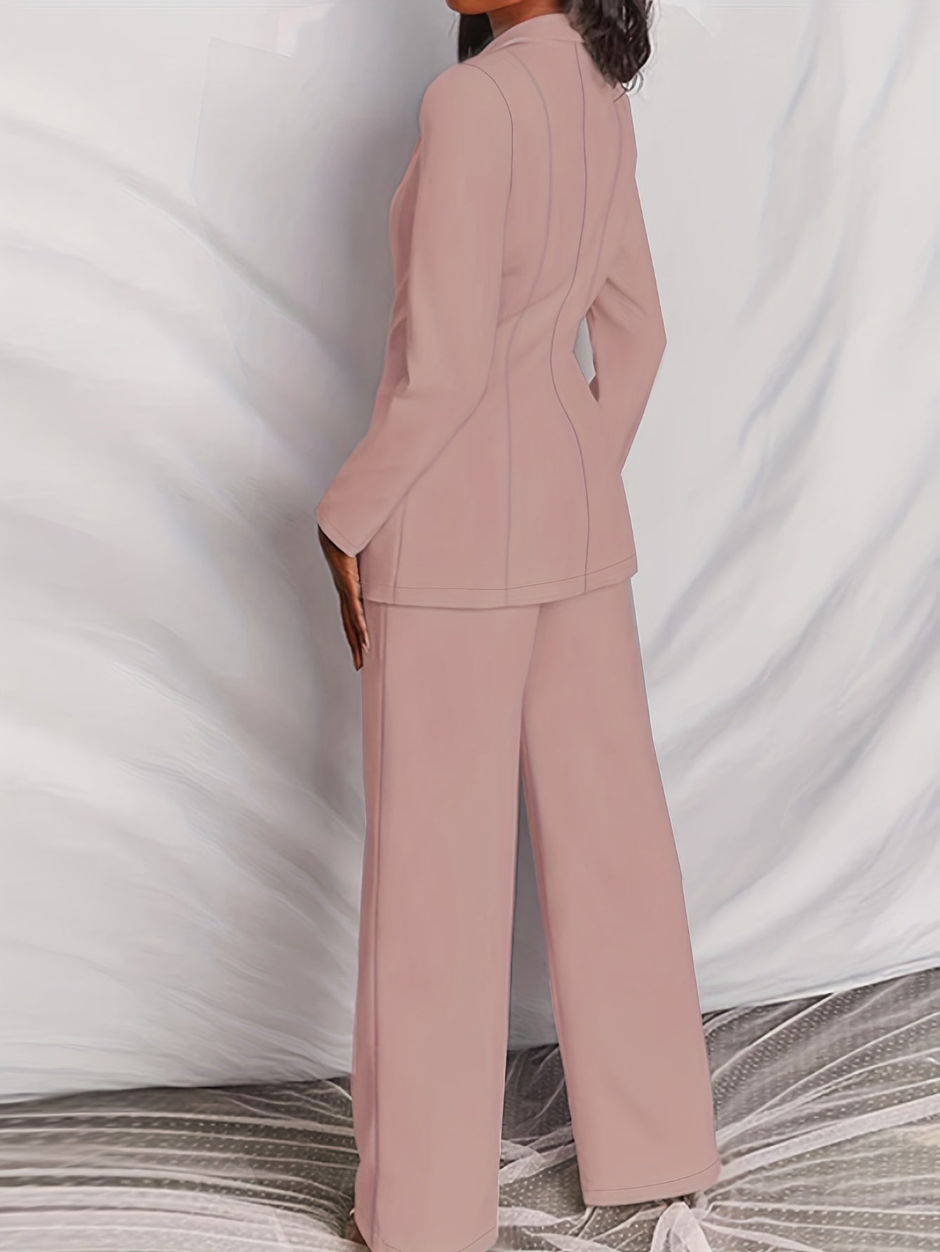 vlovelaw Plus Size Casual Suit Set, Women's Plus Solid Long Sleeve Single Breast Button Lapel Collar Suit Coat & Wide Leg Pants Suit Two Piece Set