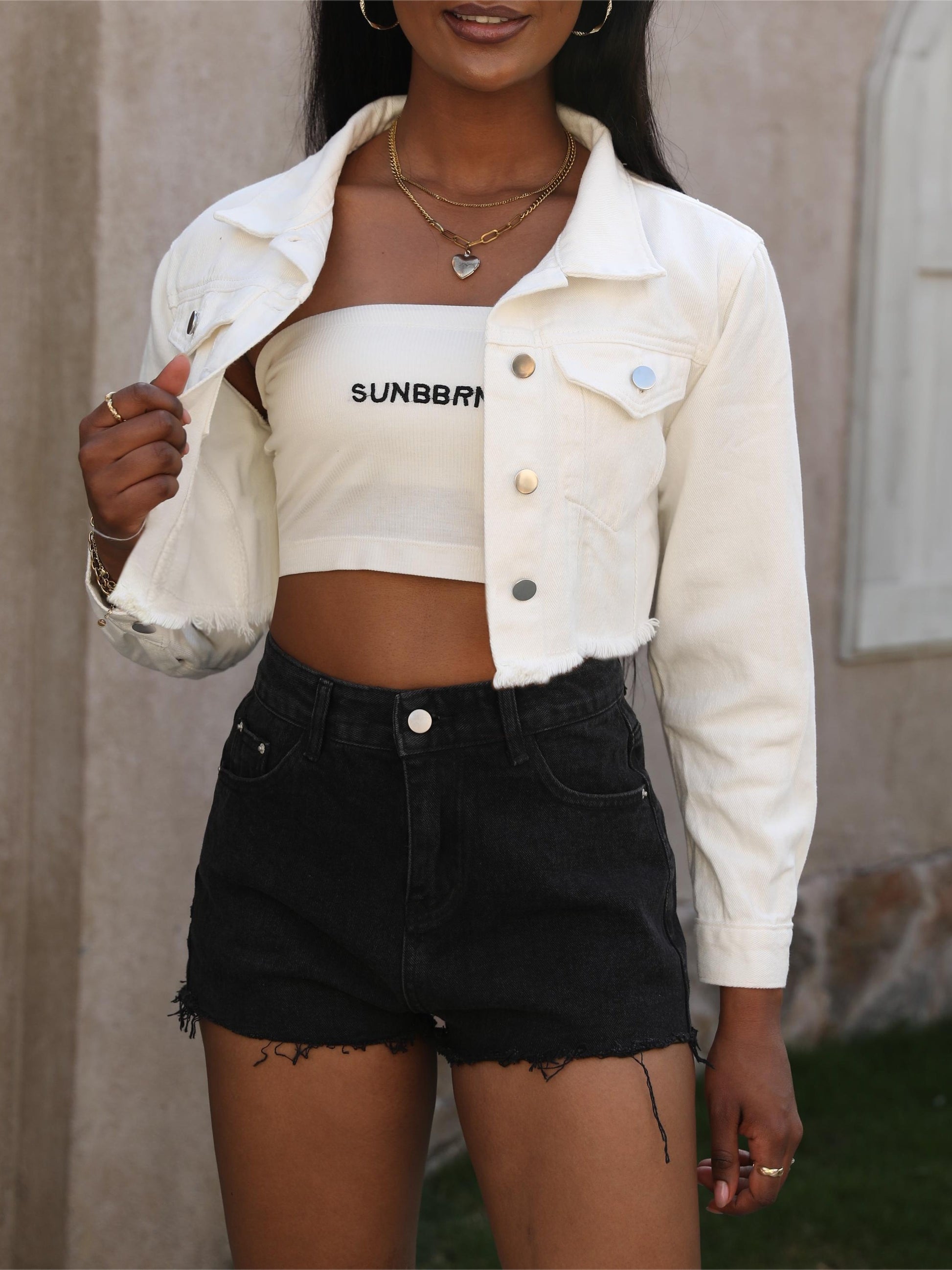 vlovelaw Raw Hem Plain Cropped Denim Coat, Lapel Single-breasted White Denim Jacket, Women's Denim Jeans & Clothing