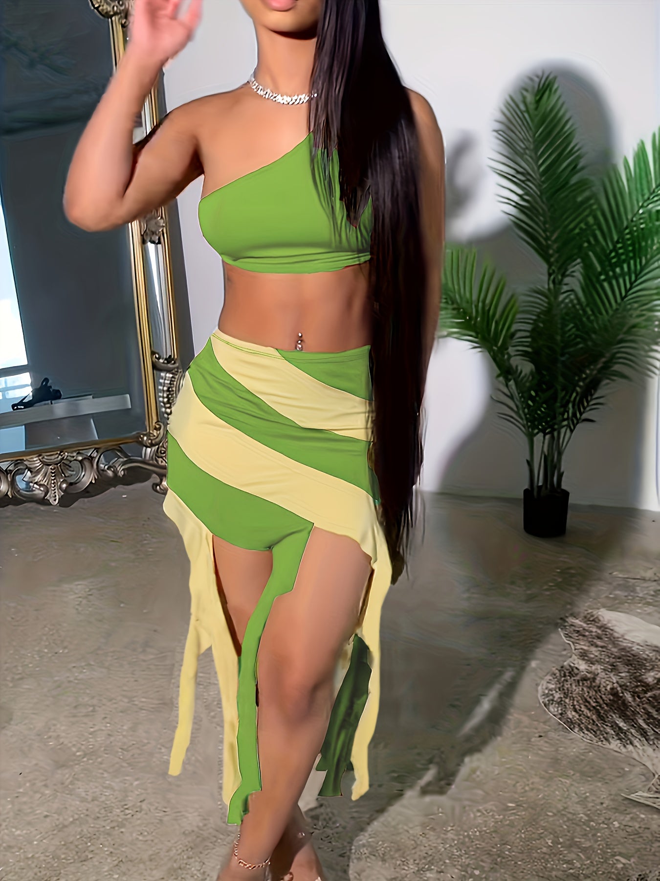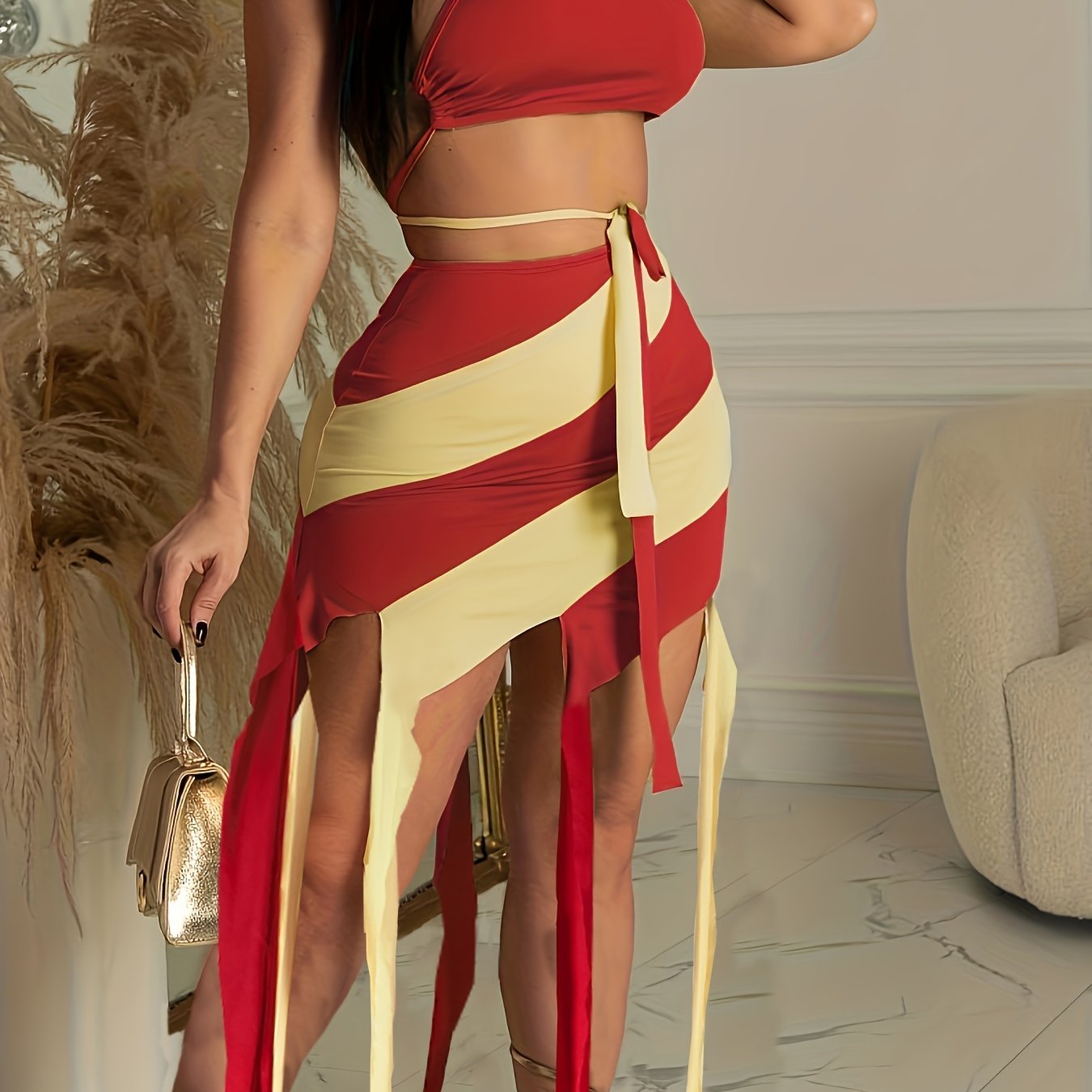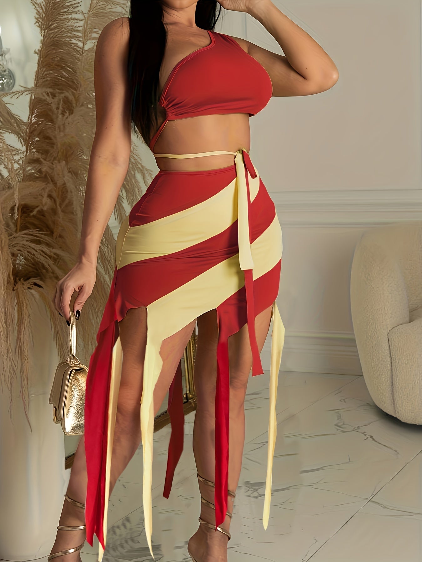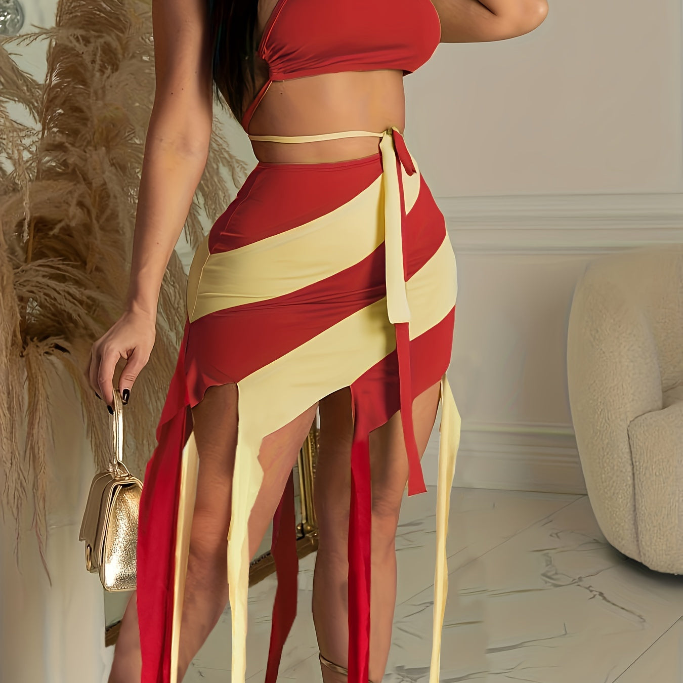 vlovelaw Sexy Color Block Two-piece Set, Backless One Shoulder Crop Top & Fringe Hem High Waist Skirt Outfits, Women's Clothing