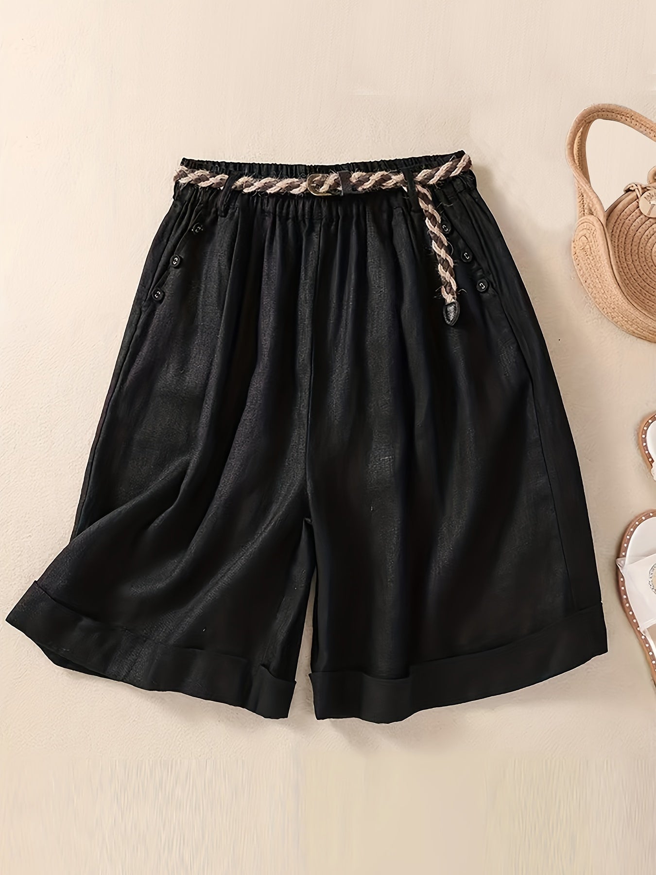 vlovelaw Slant Pockets Belted Rolled Shorts, Casual Button Decor Loose Shorts For Spring & Summer, Women's Clothing