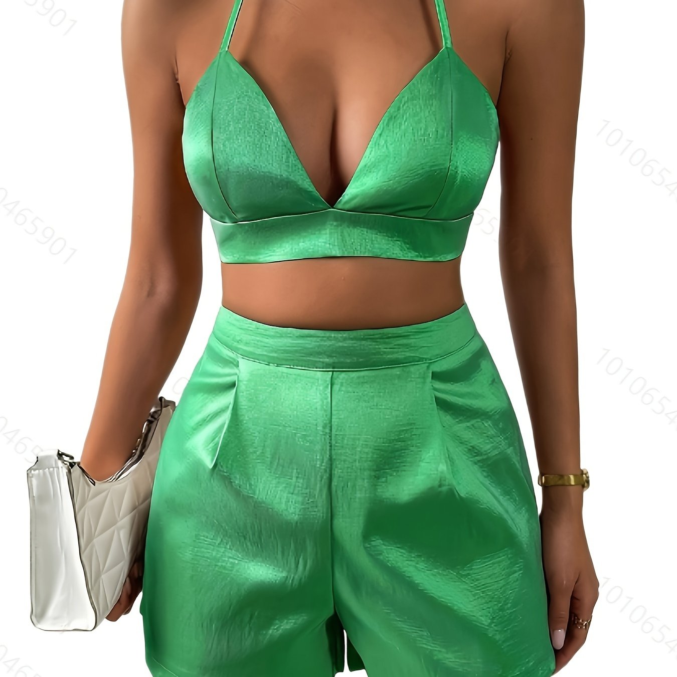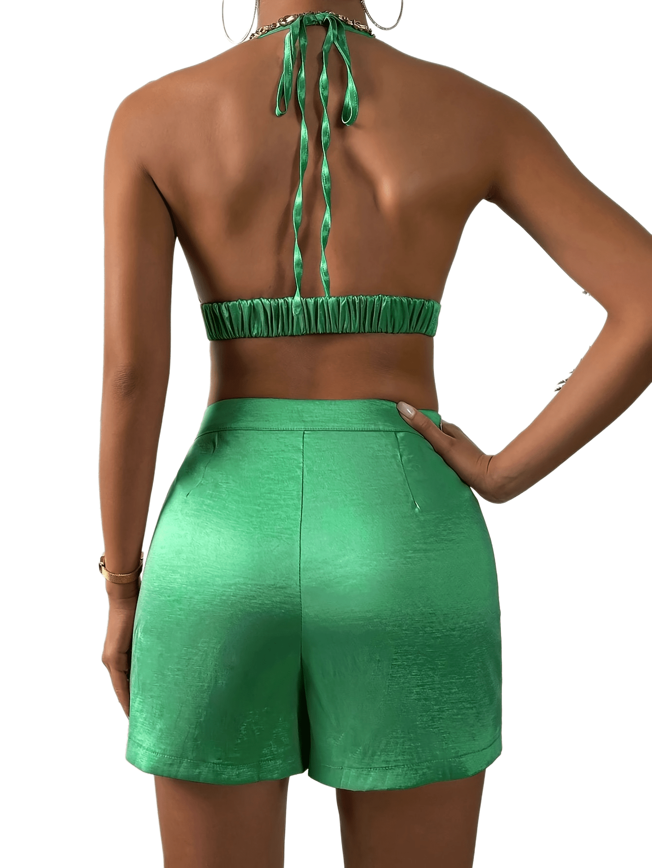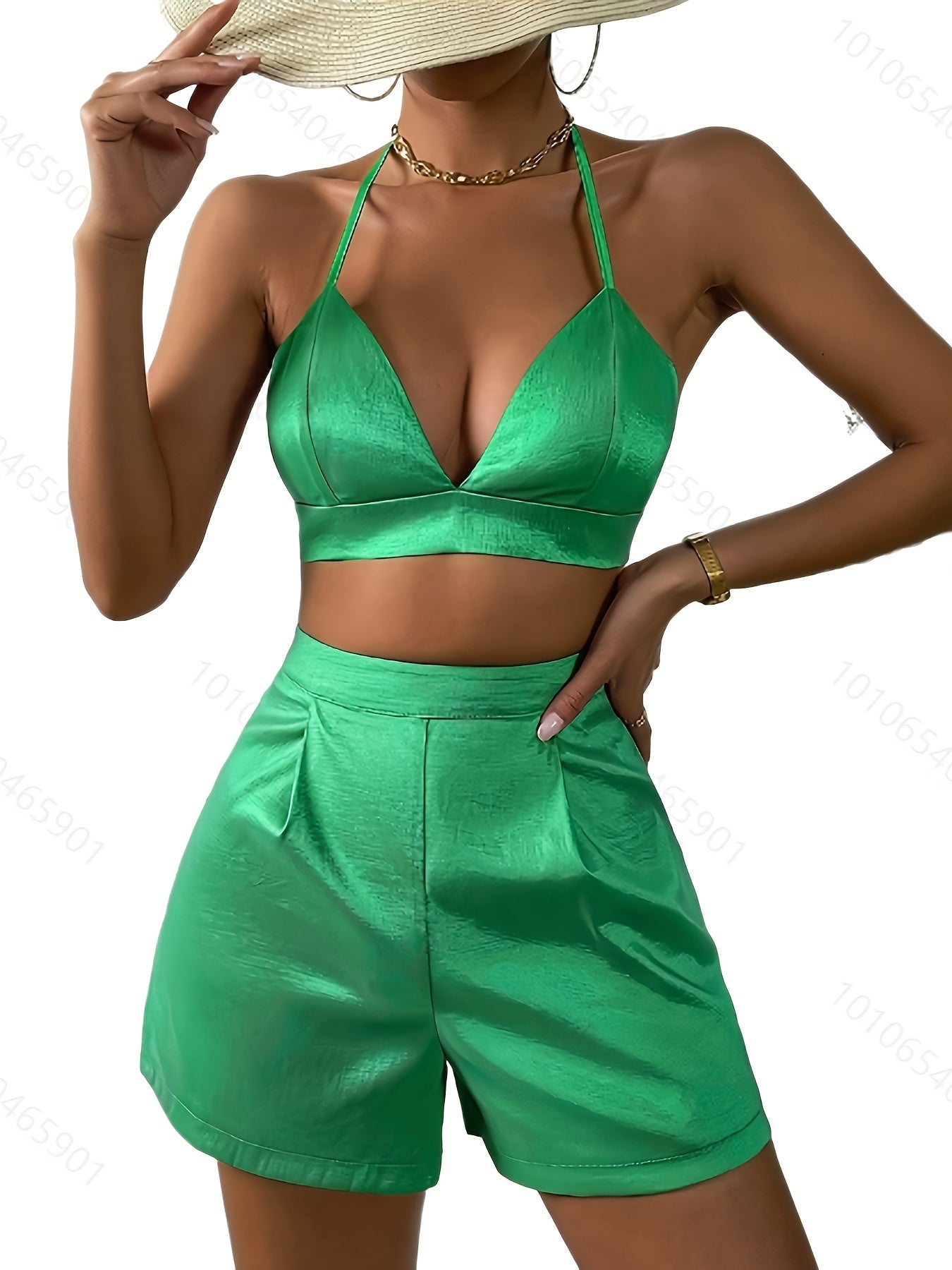 vlovelaw Solid Casual Two-piece Set, Halter Neck Crop Top & High Waist Shorts Outfits, Women's Clothing