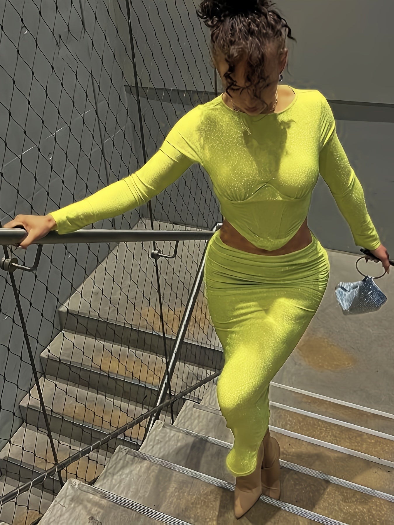 vlovelaw Solid Color Two-piece Skirt Set, Crew Neck Long Sleeve Top & Skinny Ruched Skirts Outfits, Women's Clothing
