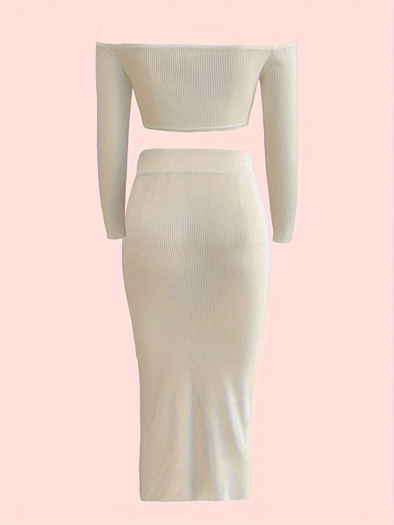 vlovelaw Solid Color Two-piece Skirt Set, Off Shoulder Long Sleeve Crop Top & Button Decor Split Skirt Outfits, Women's Clothing