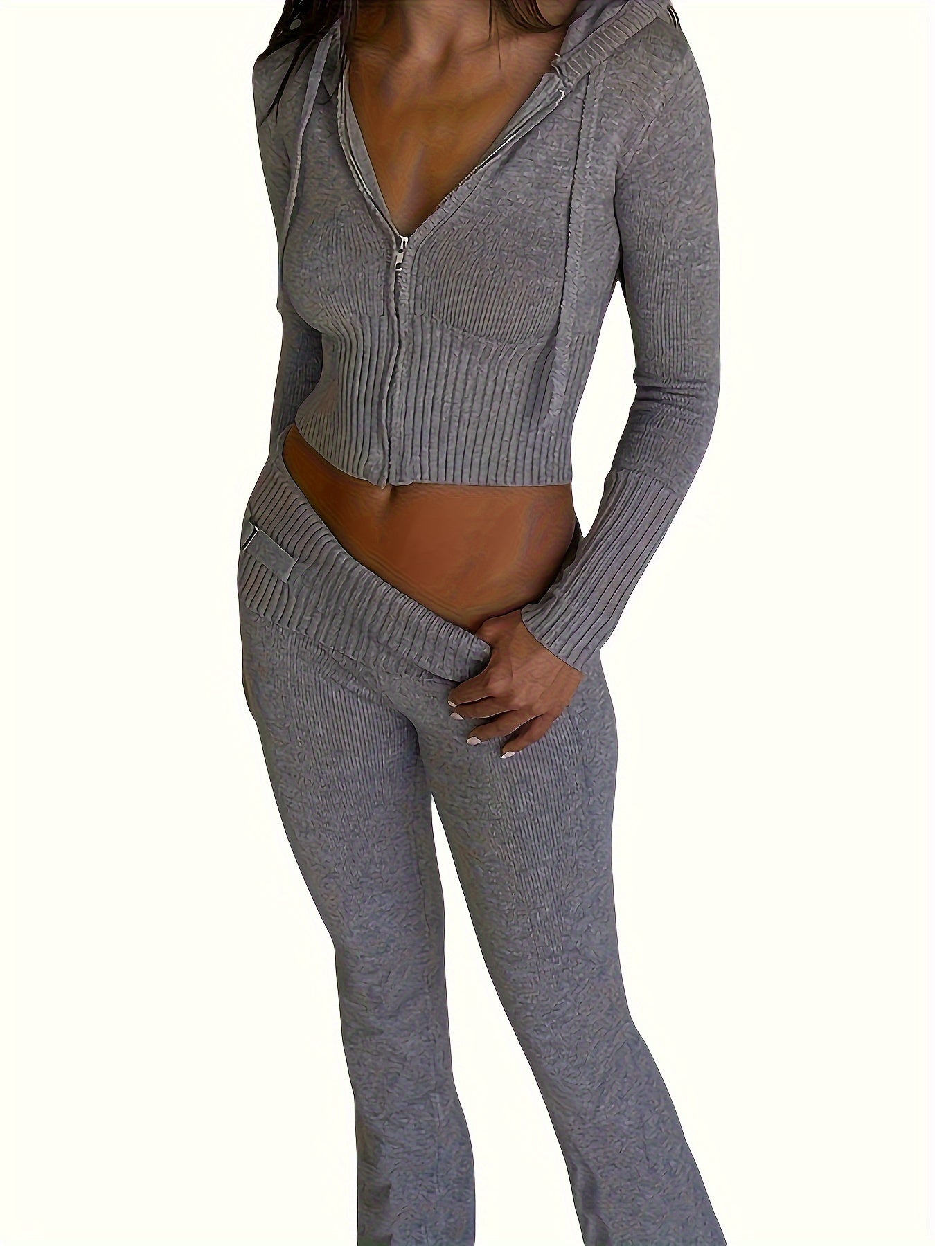 vlovelaw Solid Knitted Casual Two-piece Set, Zip Up Hooded Crop Top & Pants Outfits, Women's Clothing