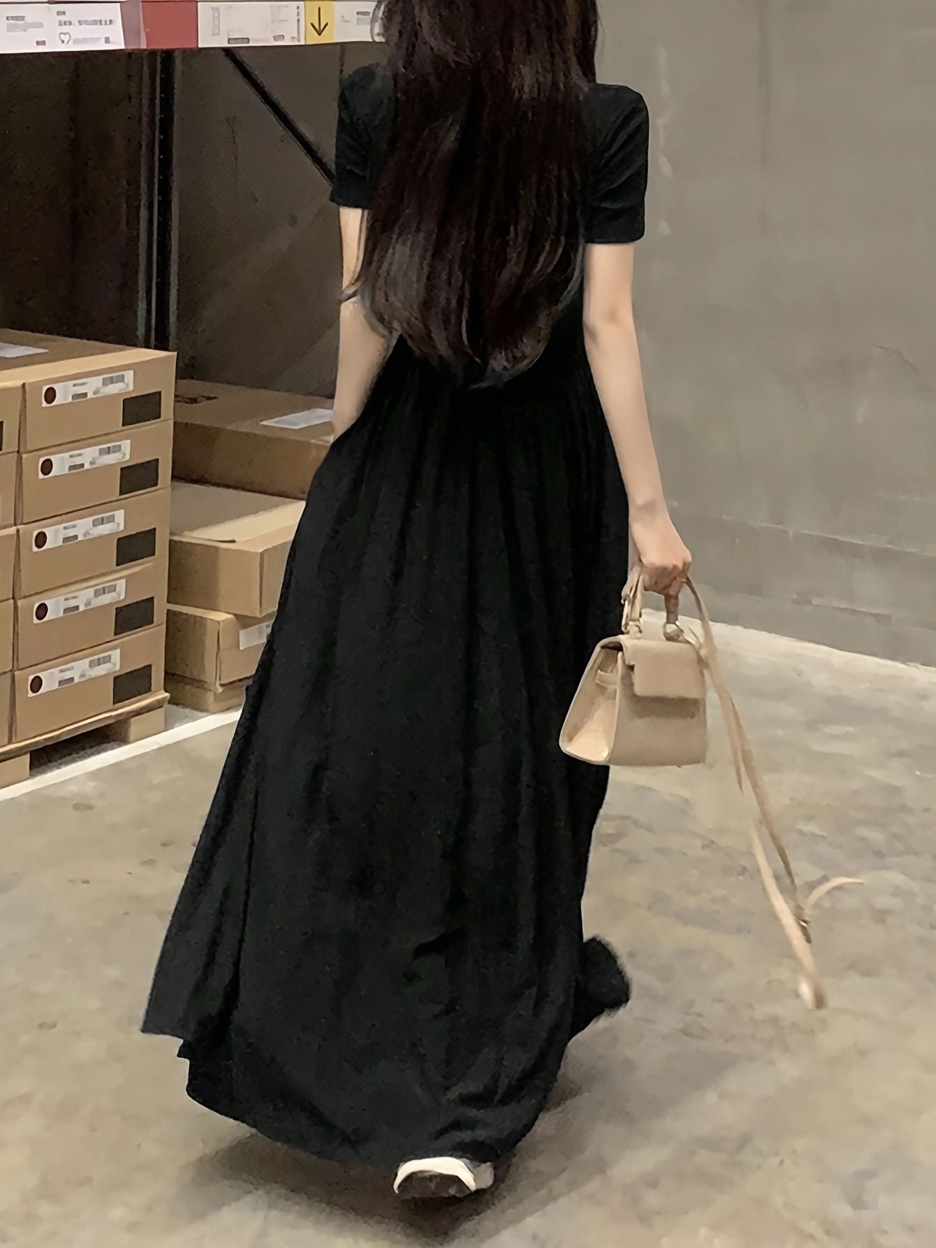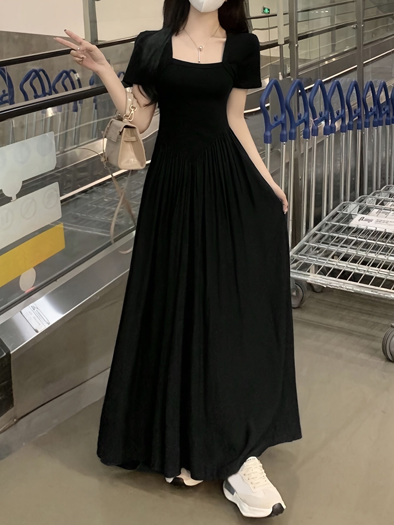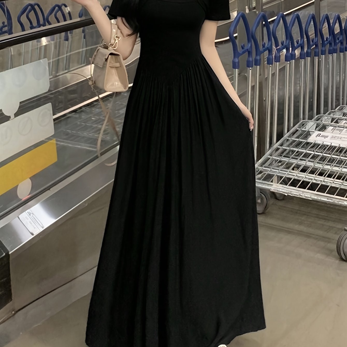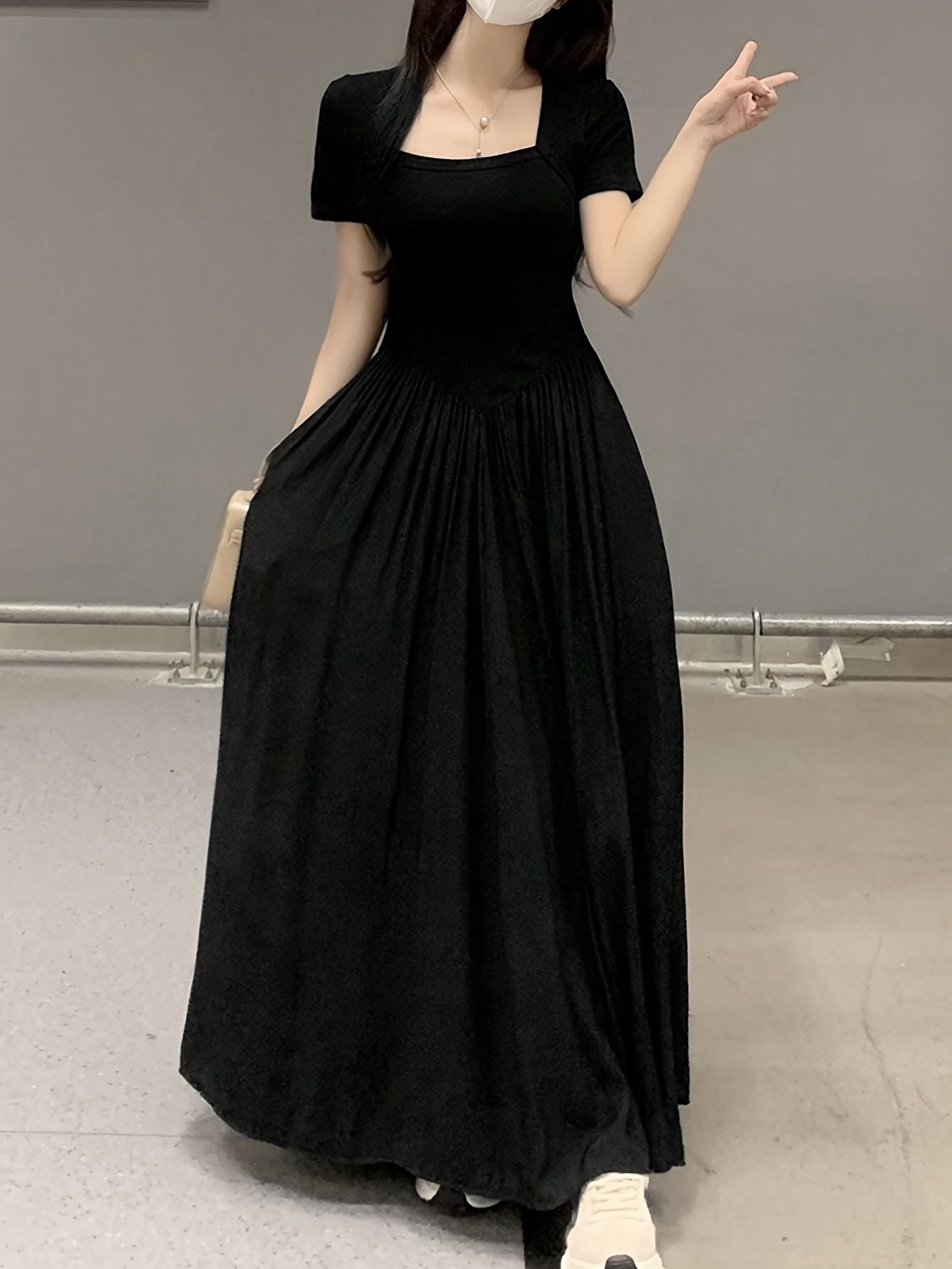 vlovelaw Solid Simple Ruched Dress, Casual Square Neck Short Sleeve Dress, Women's Clothing