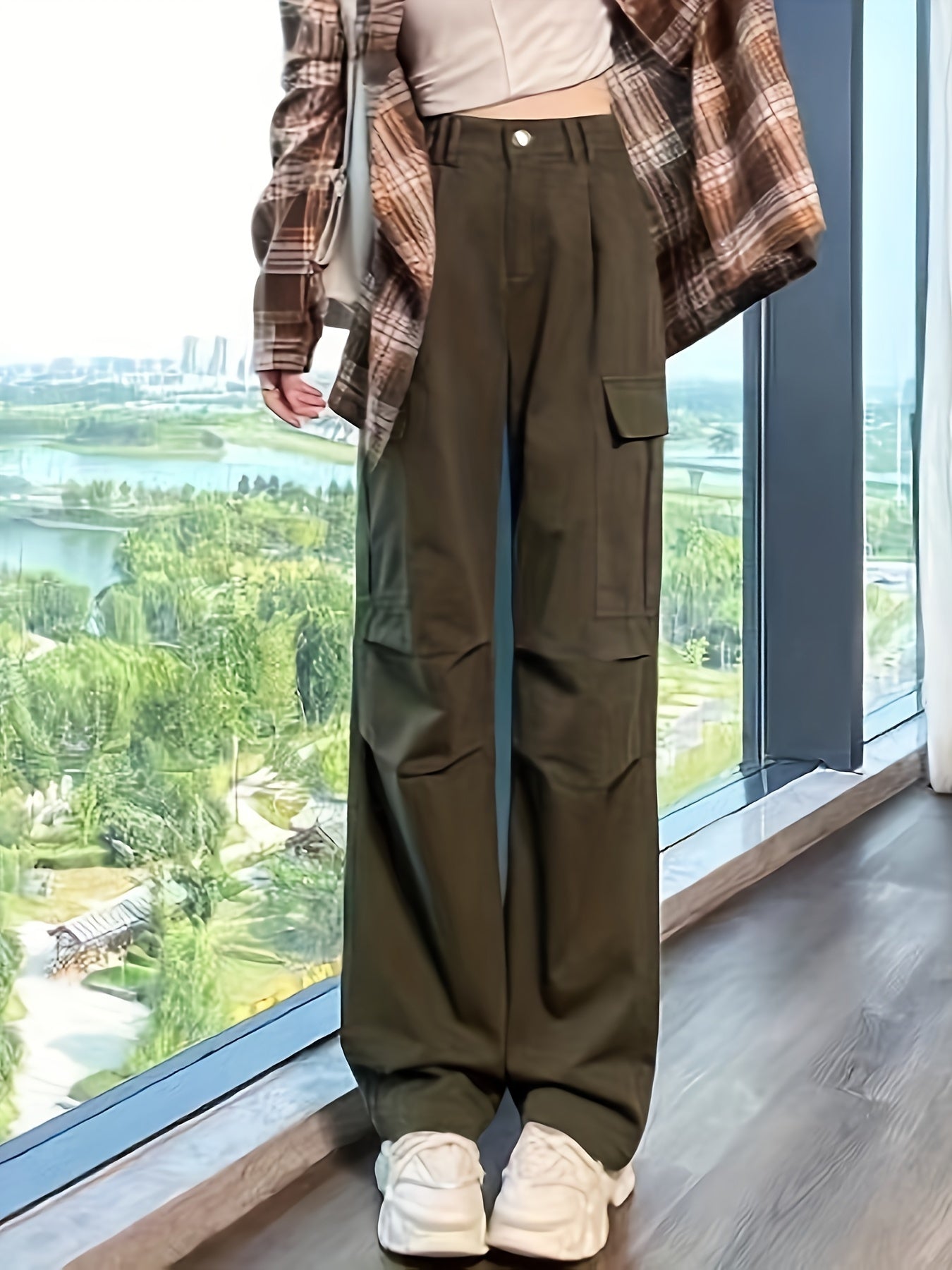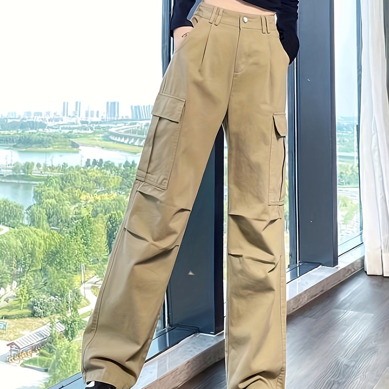 vlovelaw Solid Straight Leg Cargo Pants, Y2K Flap Pocket High Waist Loose Pants, Women's Clothing