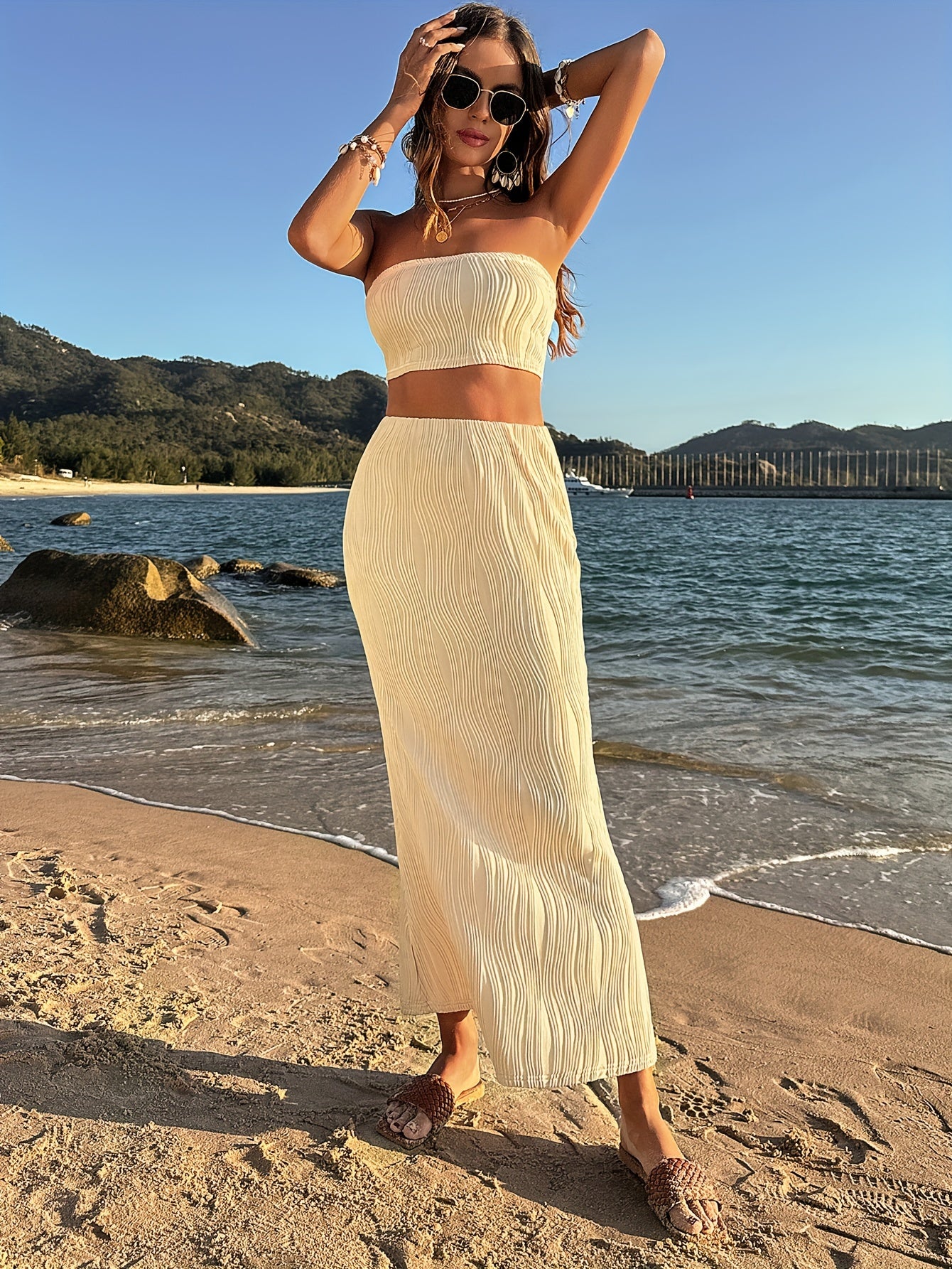vlovelaw Solid Textured Vacation Two-piece Set, Crop Tube Top & Bodycon High Waist Skirt Outfits, Women's Clothing