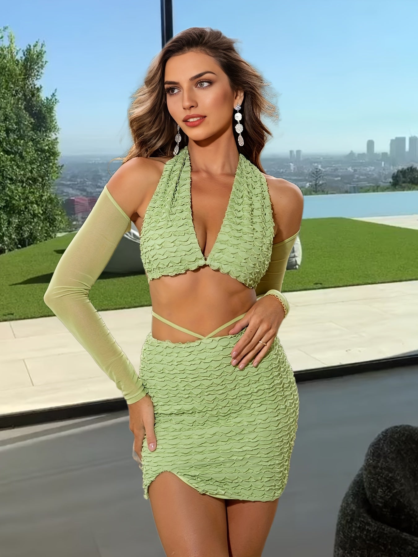 vlovelaw Textured Sexy Two-piece Set, Halter Neck Cropped Tops & Bag Hip Skirts Outfits, Women's Clothing