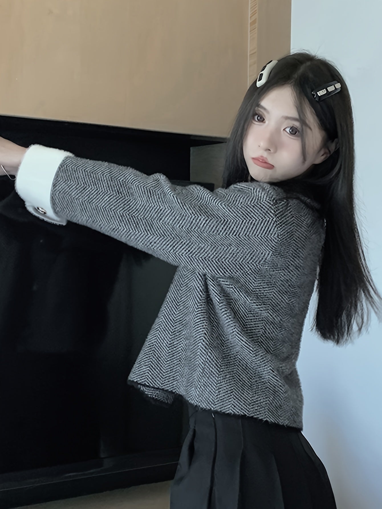 vlovelaw vlovelaw Chevron Pattern Single Breasted Jacket, Elegant Long Sleeve Winter Warm Outwear, Women's Clothing