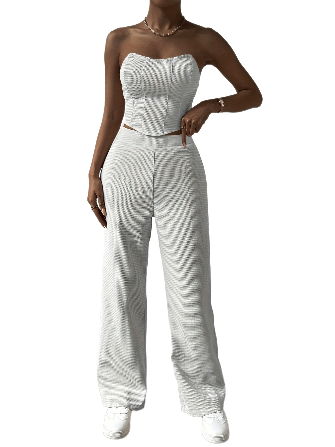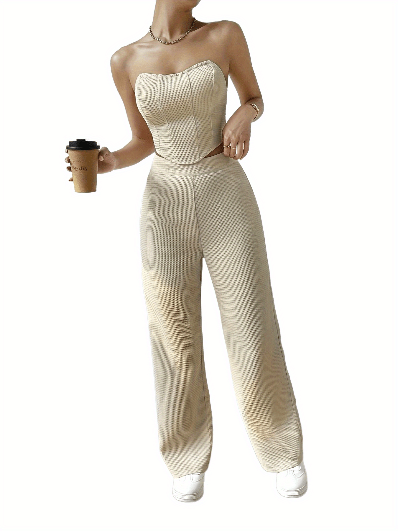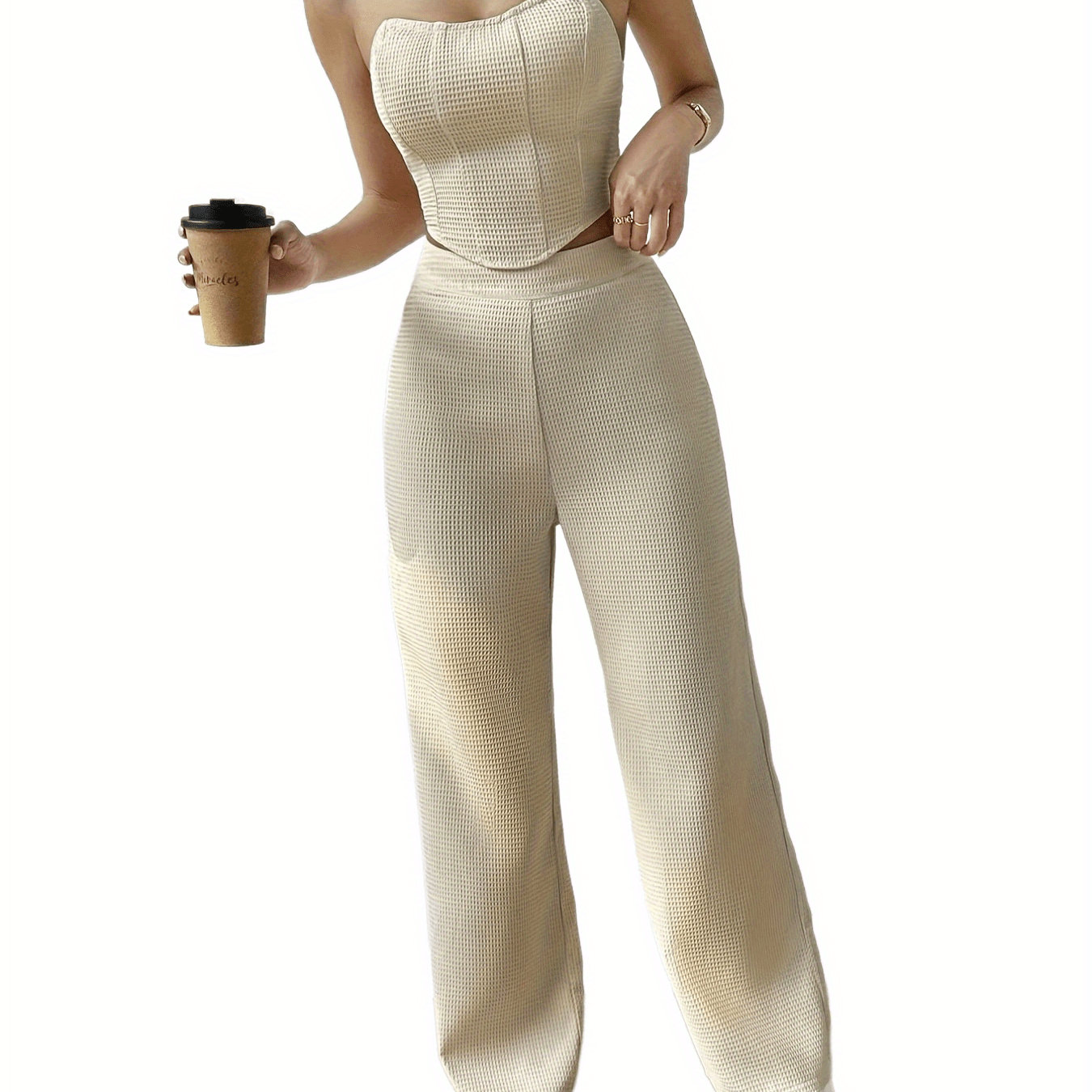 vlovelaw Waffle Knit Two-piece Set, Hanky Hem Tube Top & High Waist Wide Leg Pants Outfits, Women's Clothing