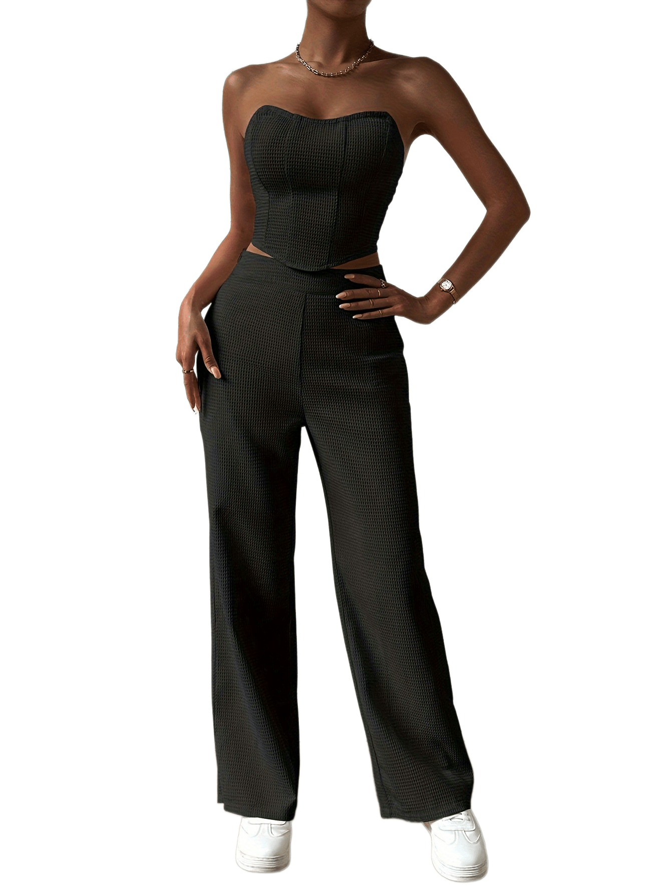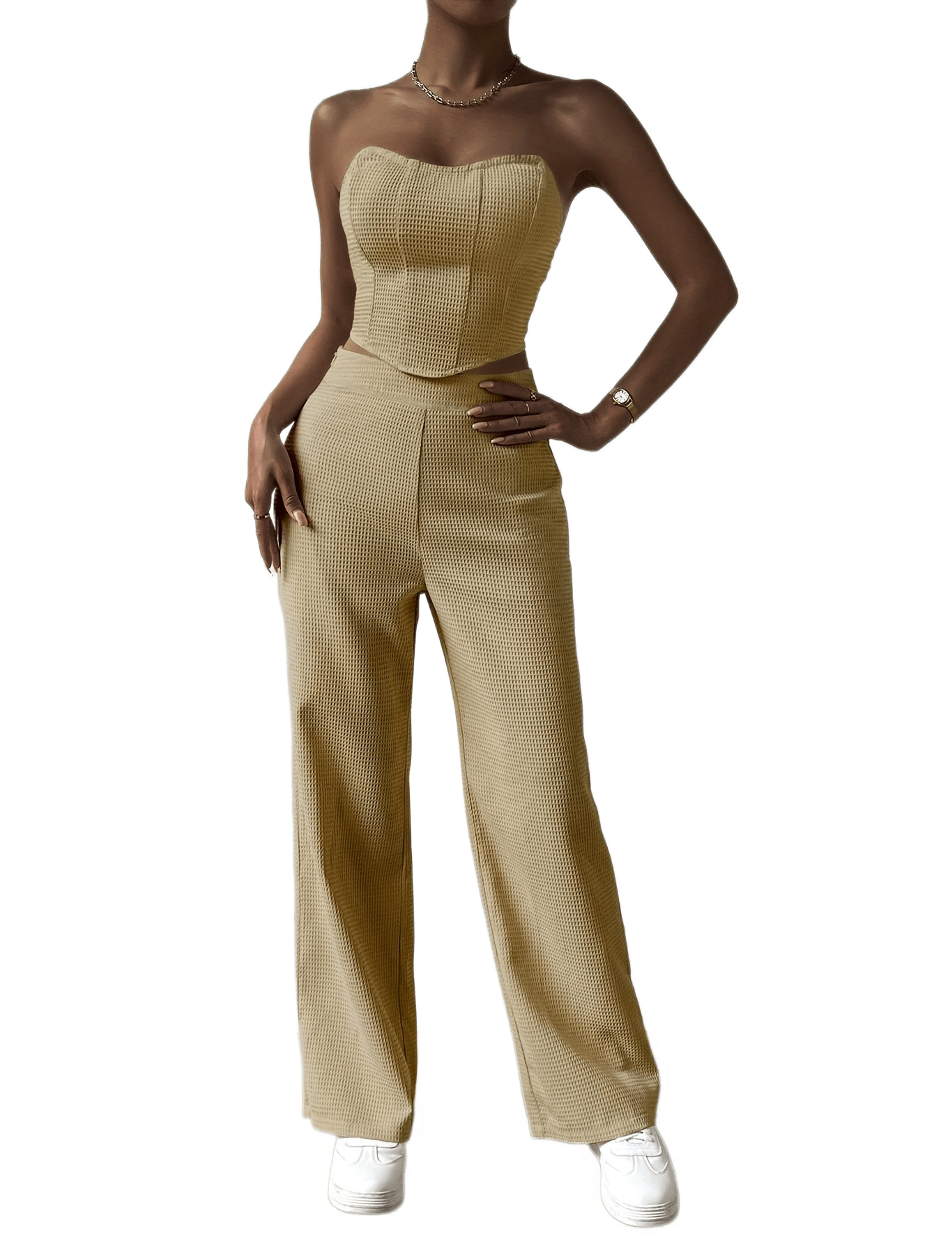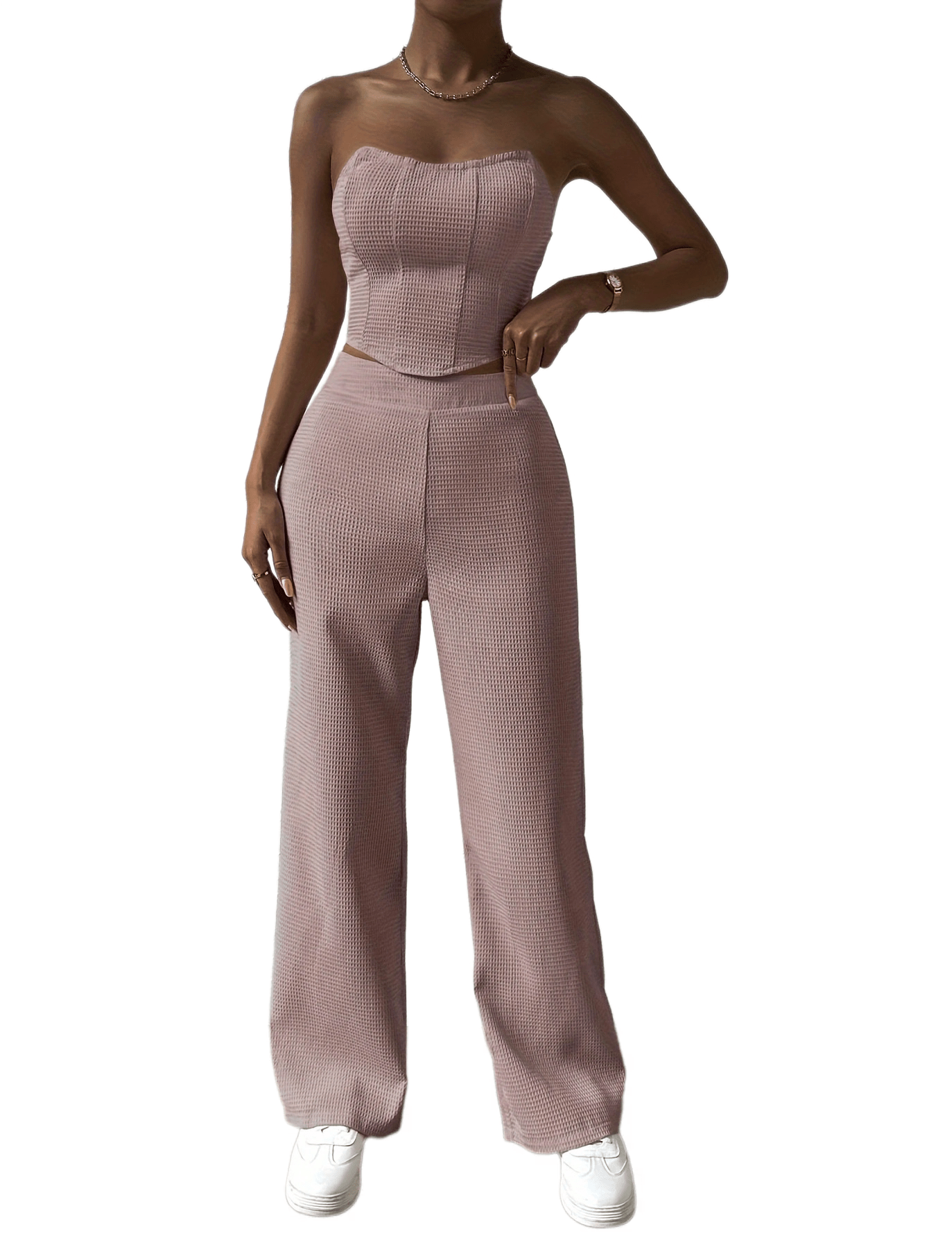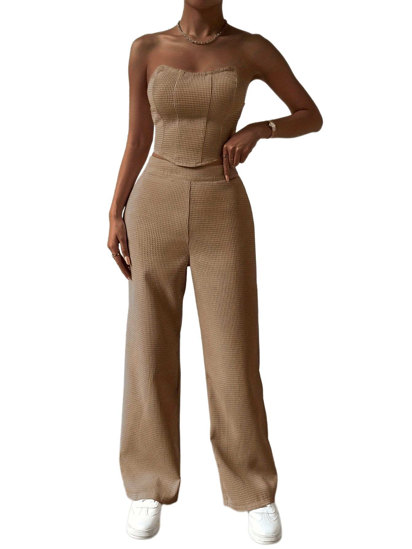 vlovelaw Waffle Knit Two-piece Set, Hanky Hem Tube Top & High Waist Wide Leg Pants Outfits, Women's Clothing