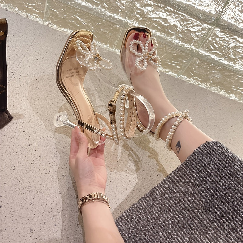 vlovelaw Women's Faux Pearl Bowknot Decor Sandals, Square Toe Ankle Buckle Strap Slingback Stiletto Shoes, Glitter Dress Shoes