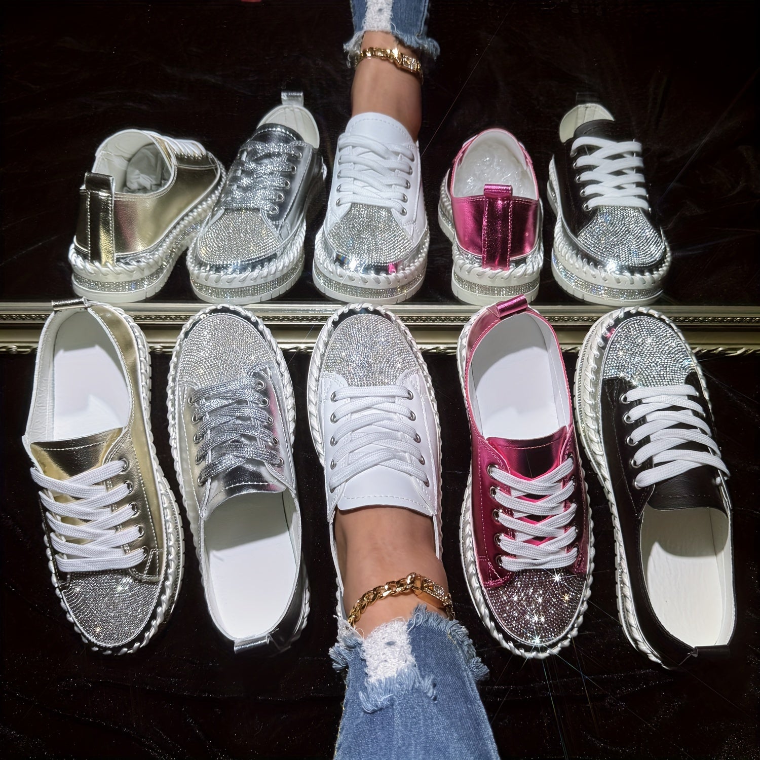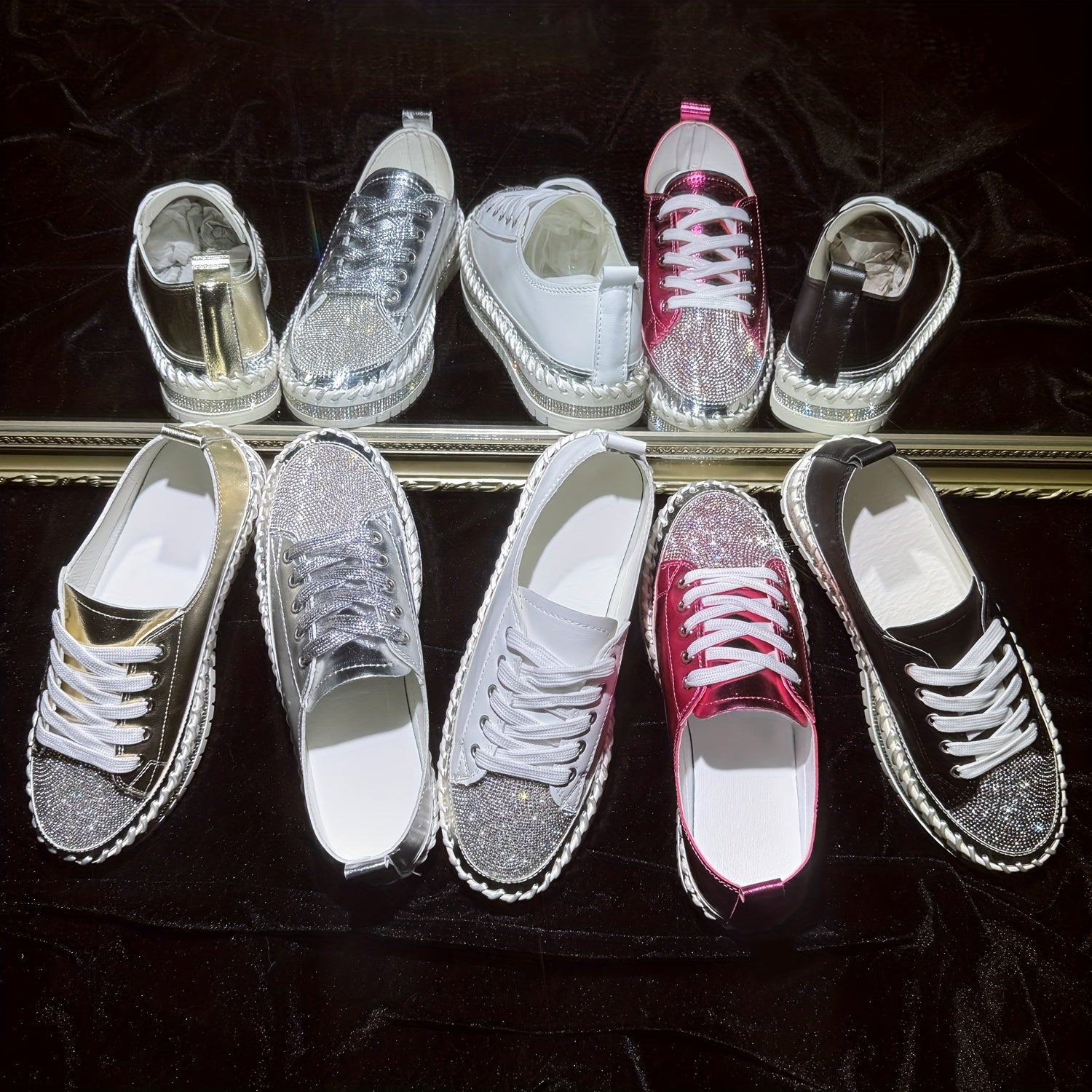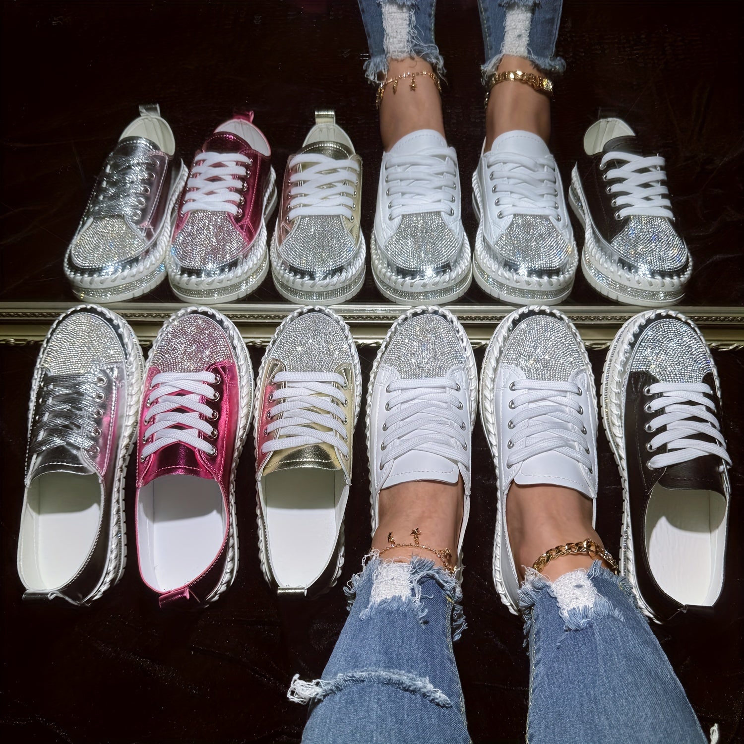 vlovelaw Women's Rhinestone Flat Sneakers, Fashion Round Toe Lace Up Low Top Skate Shoes, All-Match Outdoor Trainers