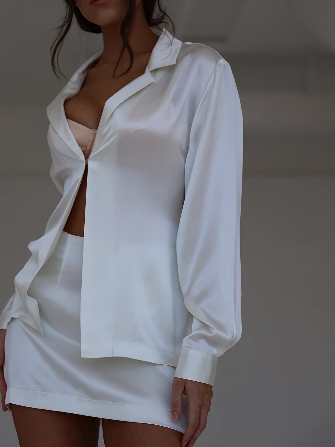 vlovelaw Women's Stylish Two Piece Blouse Set, Solid Lapel Blouse & High Waist Mini Skirt, Women's Clothing