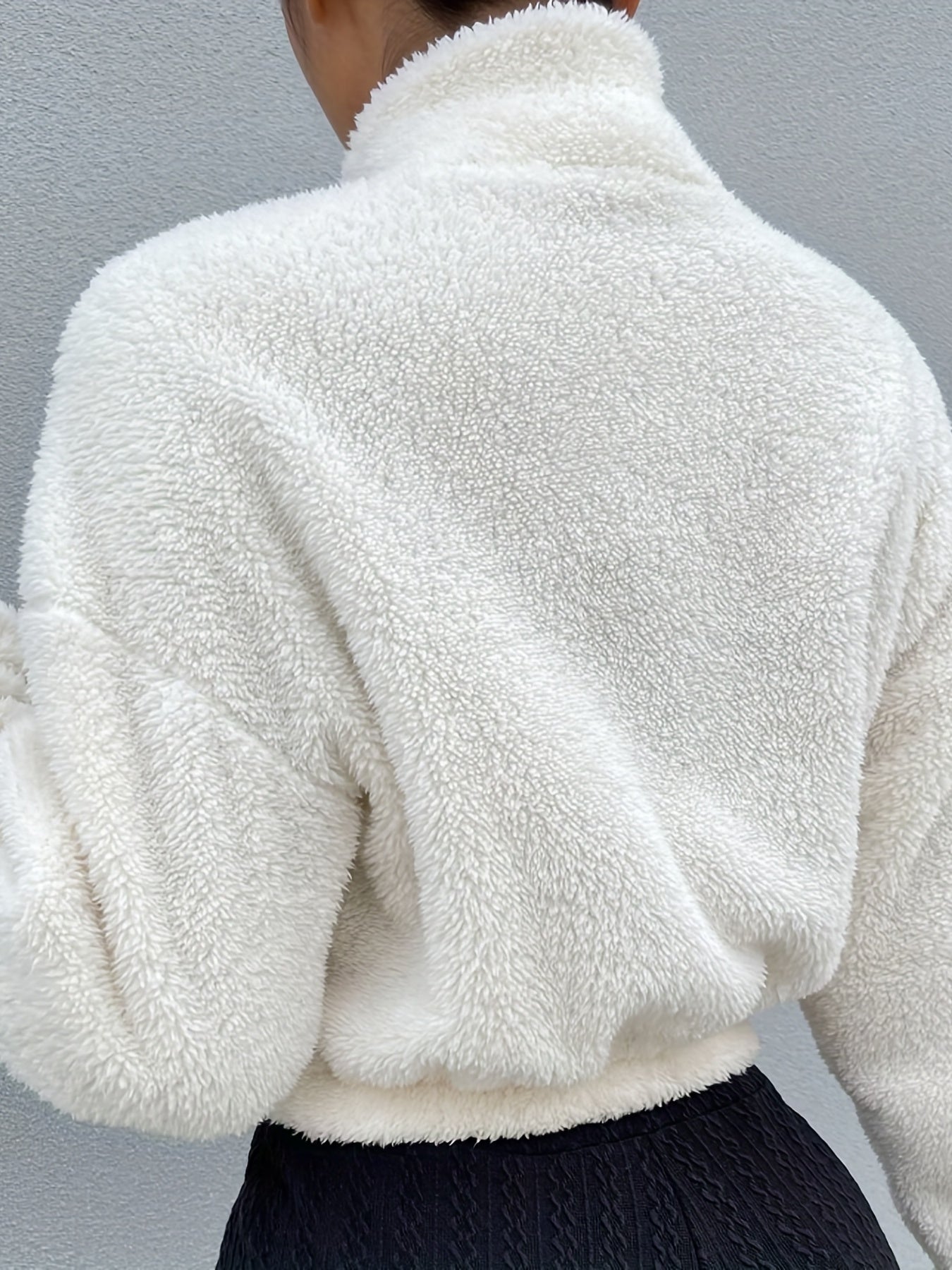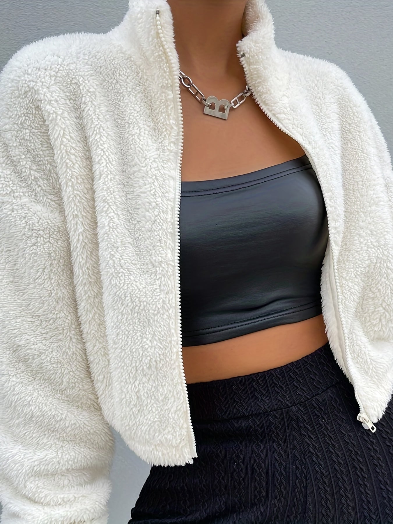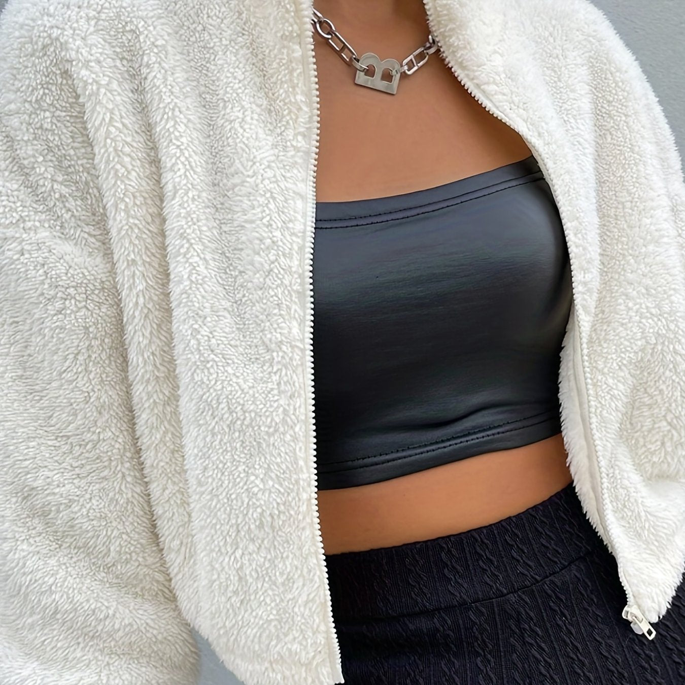 vlovelaw Zip Up Teddy Jacket, Casual High Neck Long Sleeve Outerwear, Women's Clothing