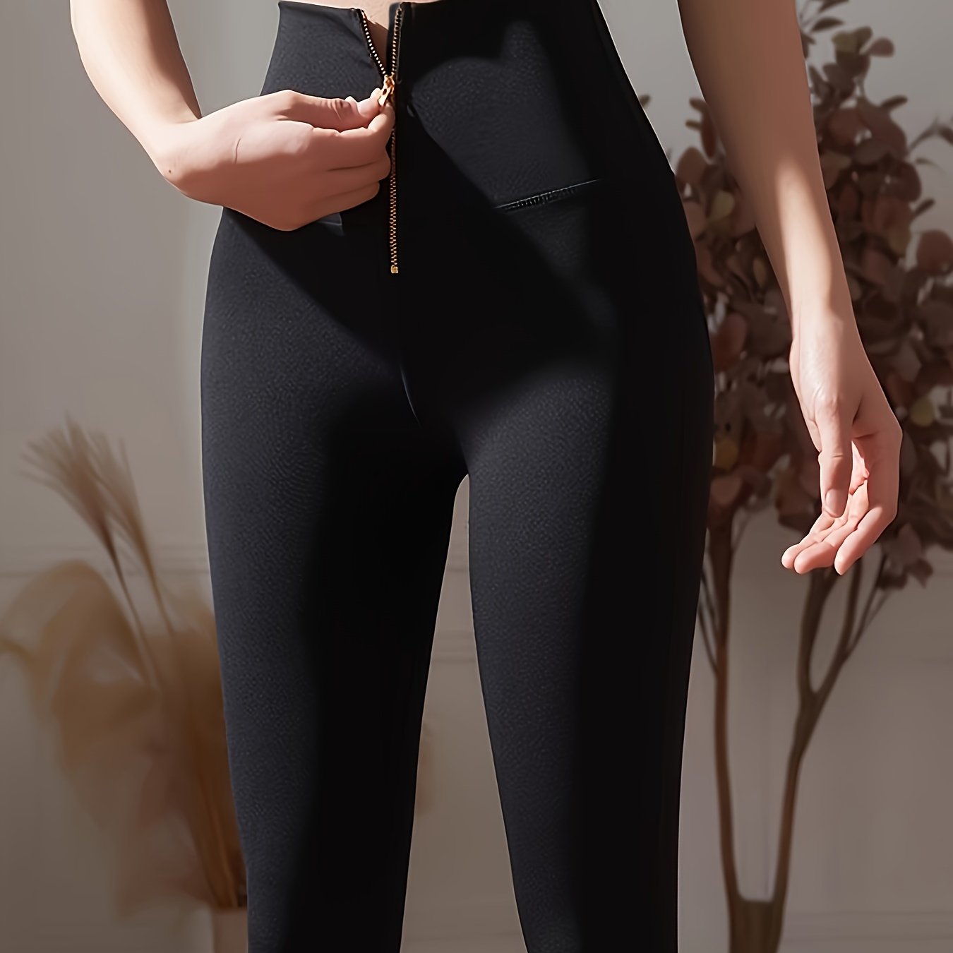 vlovelaw Zipper Front Solid Color Yoga Pants, High Waist Stretchy Running Workout Sports Leggings, Women's Activewear