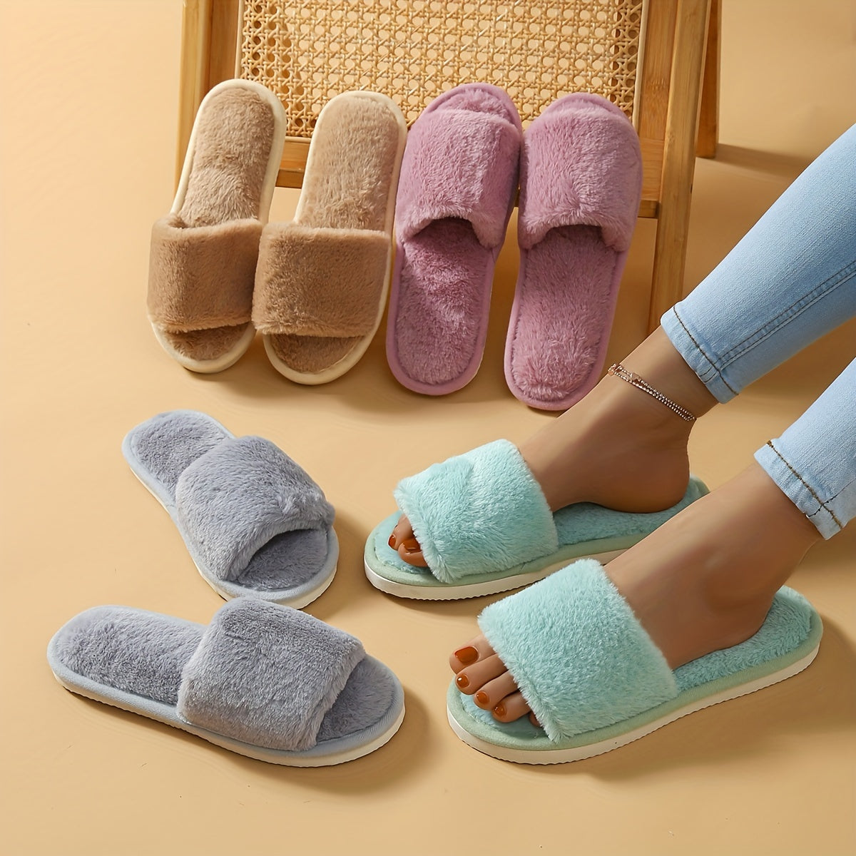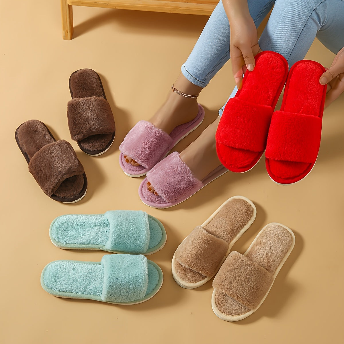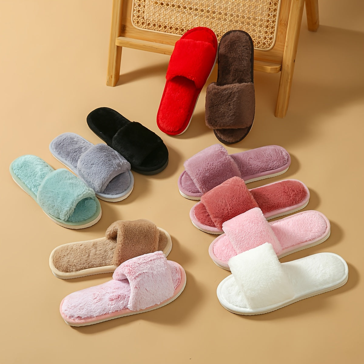 Winter Plush Open Toe Slippers, Solid Color Cozy & Warm Slip On Shoes, Comfy Indoor Floor Slippers