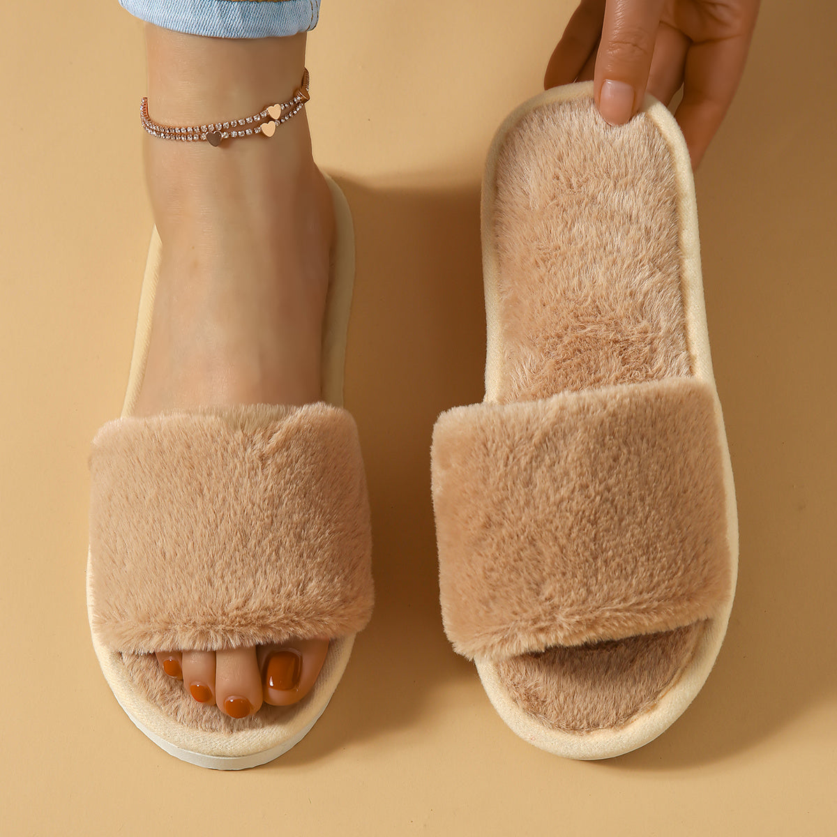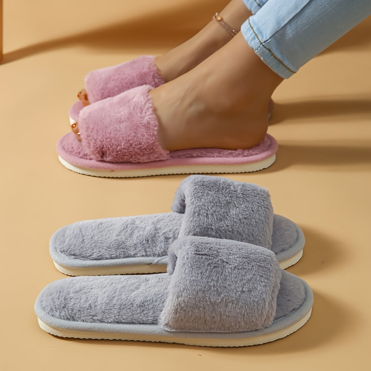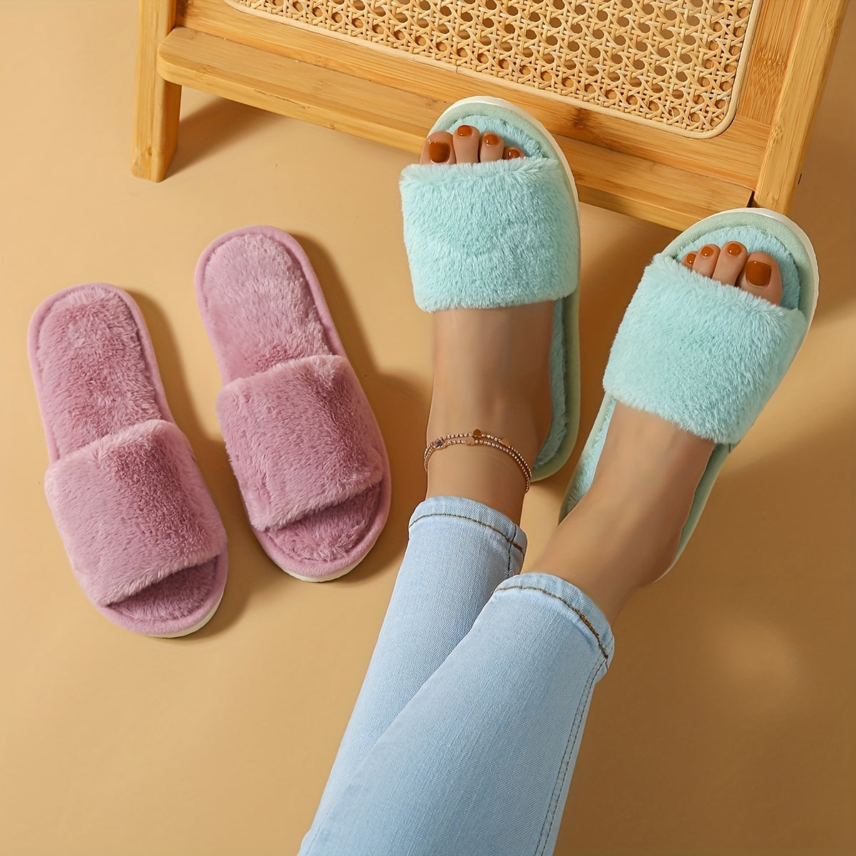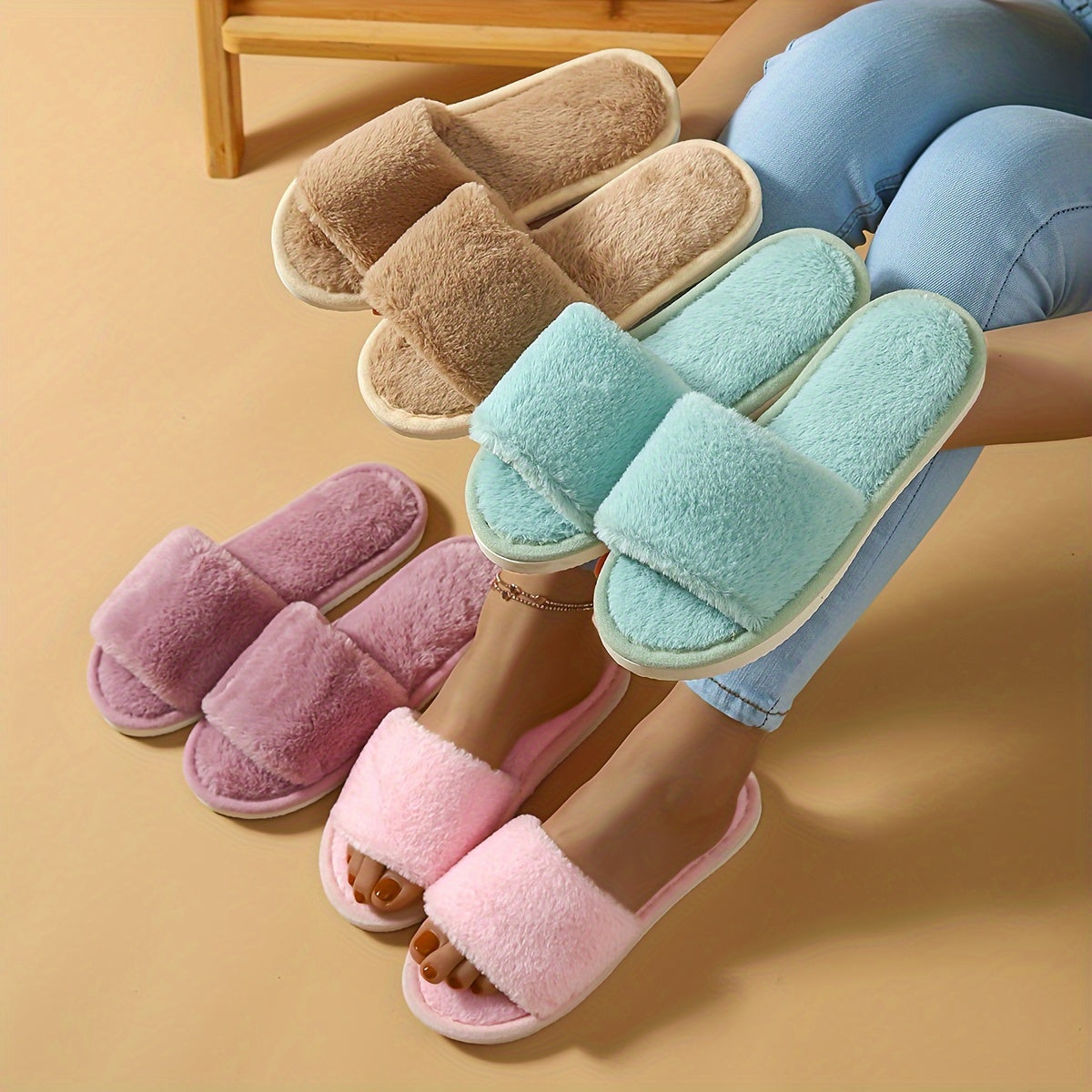 Winter Plush Open Toe Slippers, Solid Color Cozy & Warm Slip On Shoes, Comfy Indoor Floor Slippers
