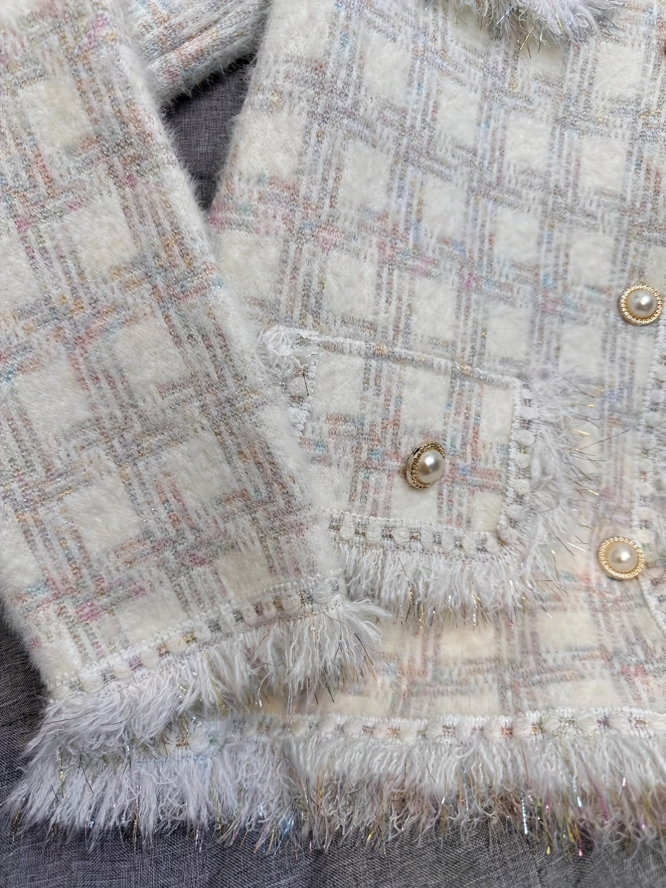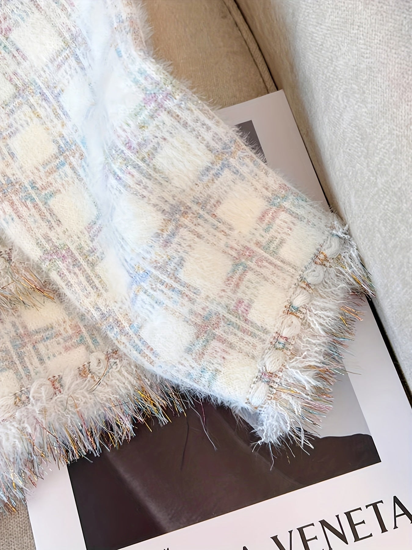 Women's Chic Long Sleeve Knitted Coat - Elegant Plaid Design, Button Front, Raw Trim, Dual Pockets, Fall & Winter Essential