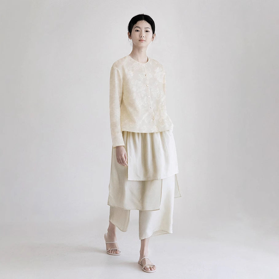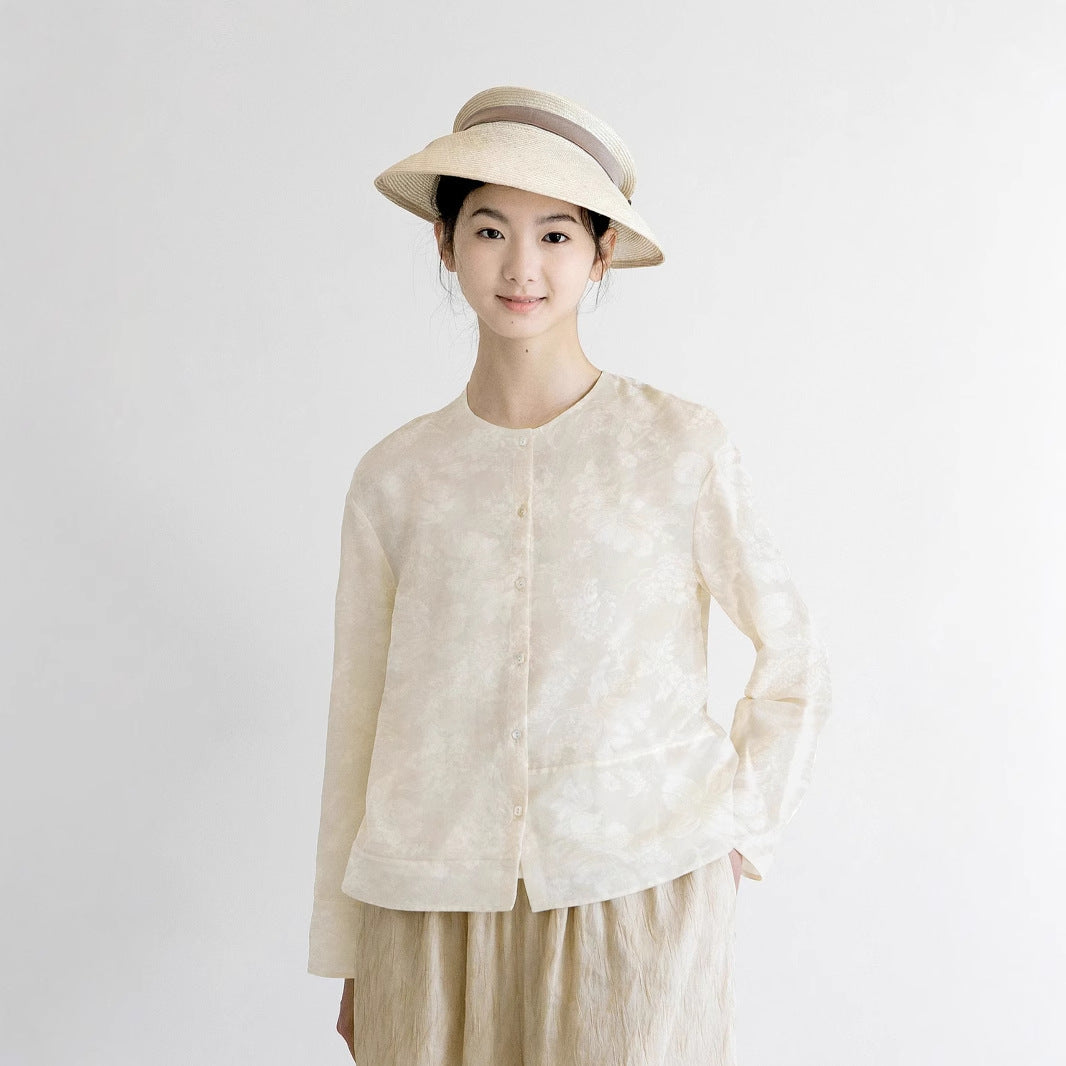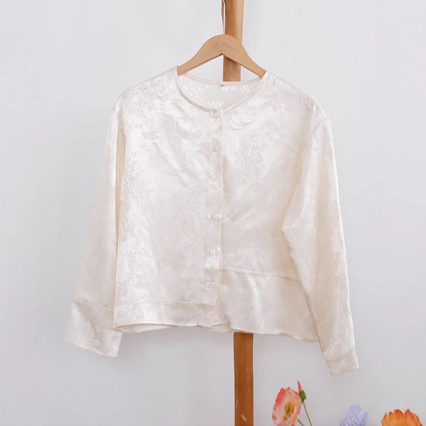 Women's Shirt Spring New Chinese Top Shirt Long Sleeve Chinese Women's Beige Crew Neck Casual Cardigan B0456
