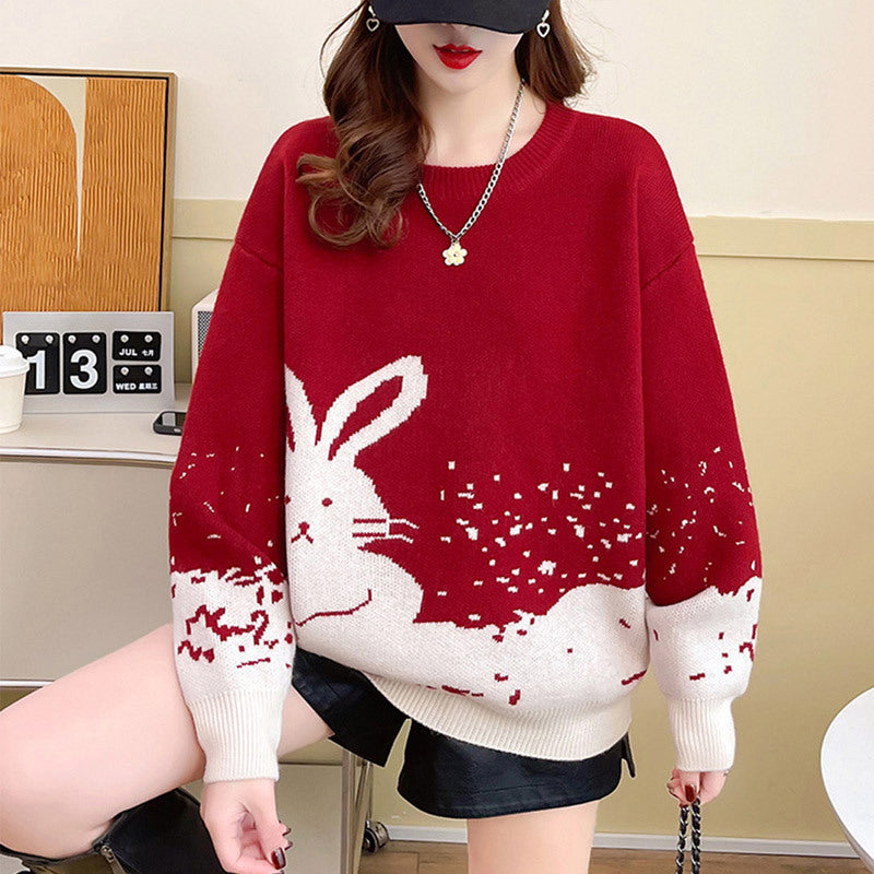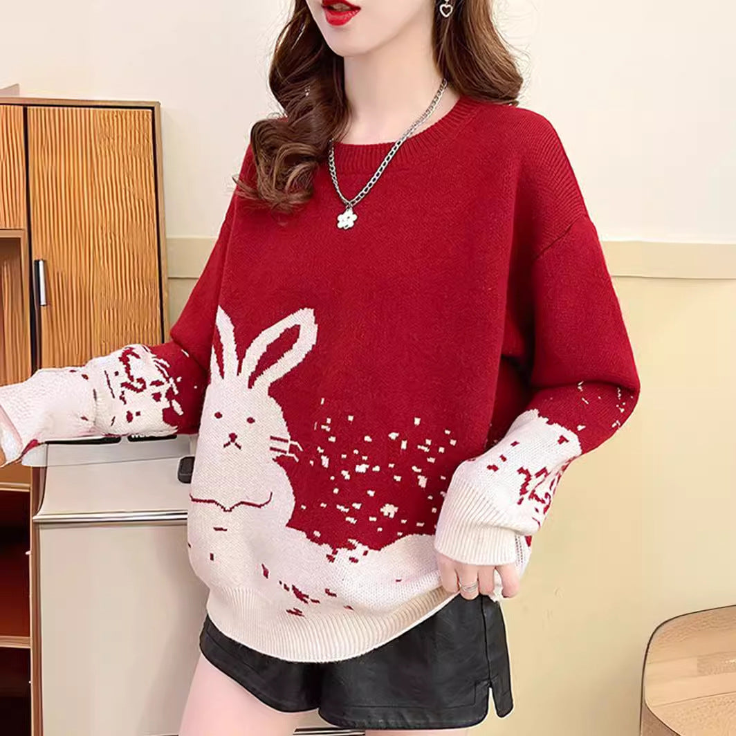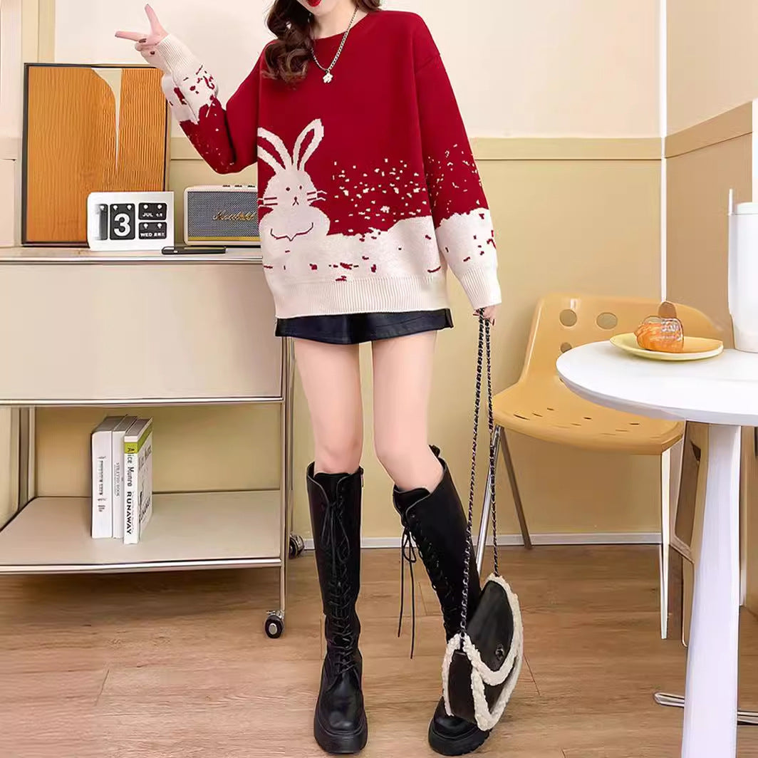 Year of the Rabbit red sweater female natal year autumn and winter loose new popular thickened Popular style festive bottoming shirt